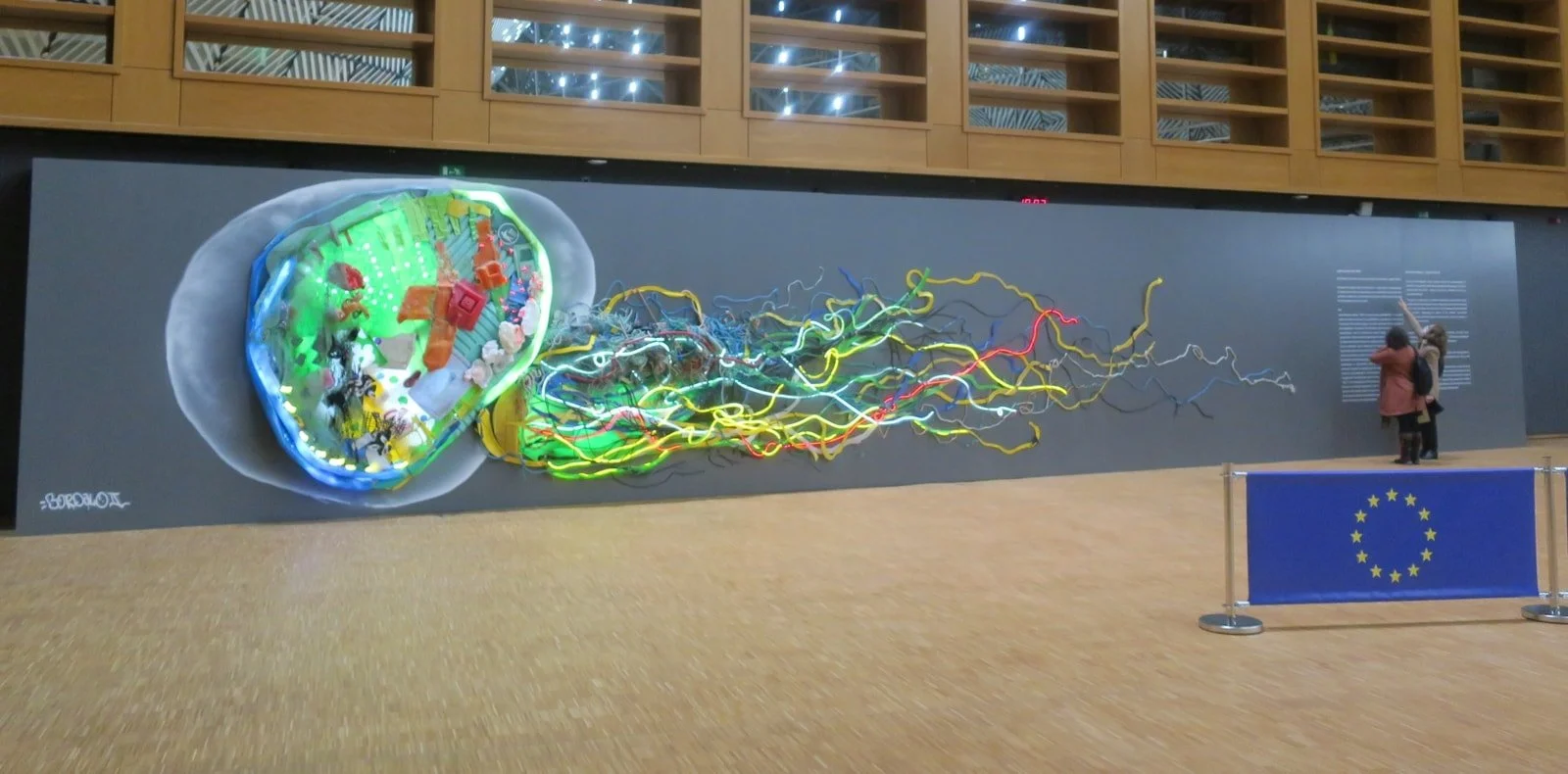 Although the original focus of the artwork - waste and it's contamination at a global level, this one approaches, more specifically, the ocean waste pollution problematic, which affects not only the marine species but also the Animal Man and its food chain.